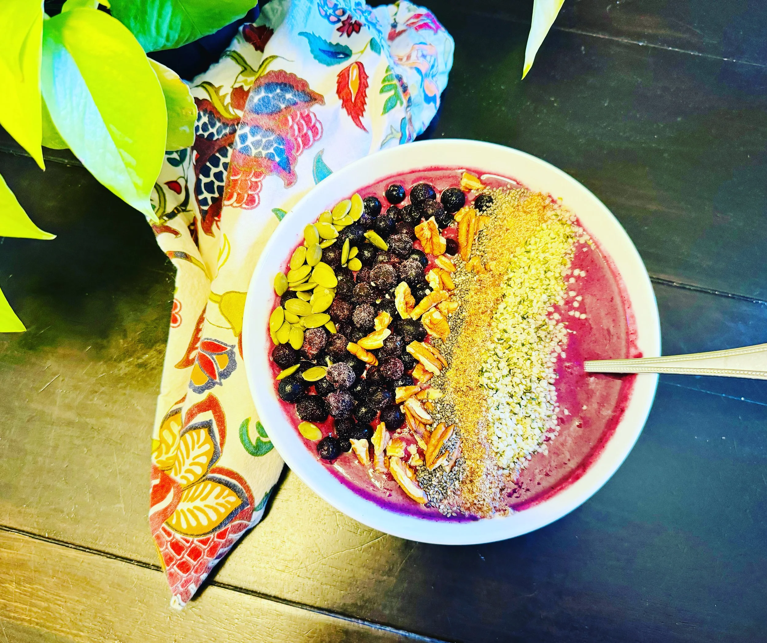 Add coconut water or nut milk, frozen mixed berries, vanilla protein powder to blender and blend until smooth. Pour into a bowl and add toppings. Enjoy!